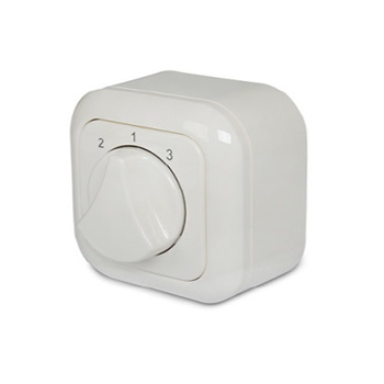 Opbouw driestanden regelaar met de standen 1, 2 en 3. Geschikt voor het schakelen van (buis) ventilatoren met 2 ingebouwde snelheden. Stand 1 = uit stand Stand 2 = de laagste van de twee snelheden Stand 3 = vol vermogen. Maximaal 10A/250V. De regelaar heeft geen transformator en dient uitsluitend voor het schakelen van de fase. Afmeting: breedte 80mm Hoogte:80mm