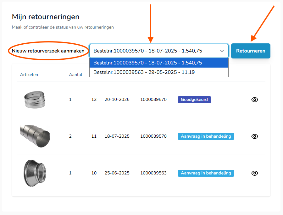 Voor een correcte verwerking vragen wij je om het retourproces te starten door in te loggen op je account. Daar kies je vervolgens in het linker menu, Retourzendingen.